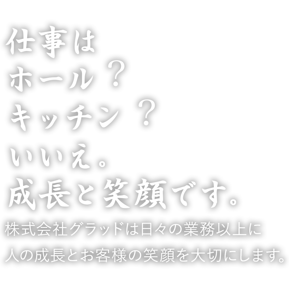 「どうやったらお客様に喜んでもらえるか」「どうやったら最高の店舗になるか」に対して常に目標を持ち、社員とアルバイト共に日々の営業に取り組んでいます。そんな仕事に対する想いが溢れる「感動と涙」のグラッド会は、グラッドの精神をより一層強いものにします。