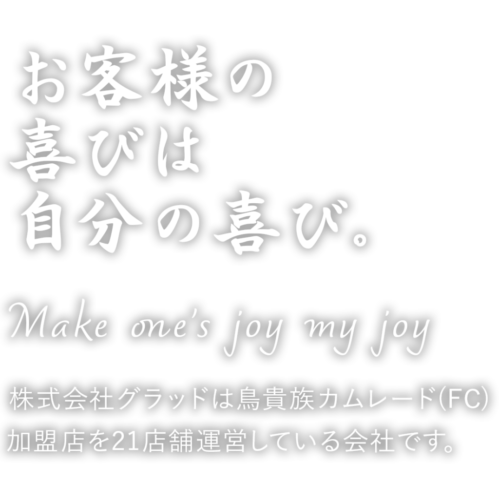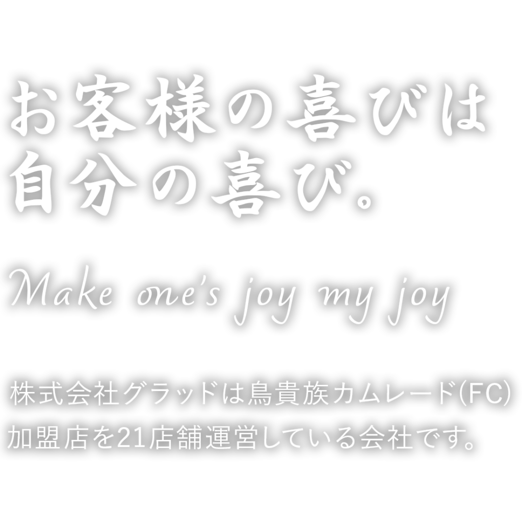 株式会社グラッドは鳥貴族カムレード(FC)を中心に事業を拡大して参りましたが、新規事業(貸別荘・BAR)も開始したことで更なる事業拡大を図る転換点に来ています。福利厚生の向上・キャリアの幅の向上をすることで、社員満足度の向上にも力を入れています。